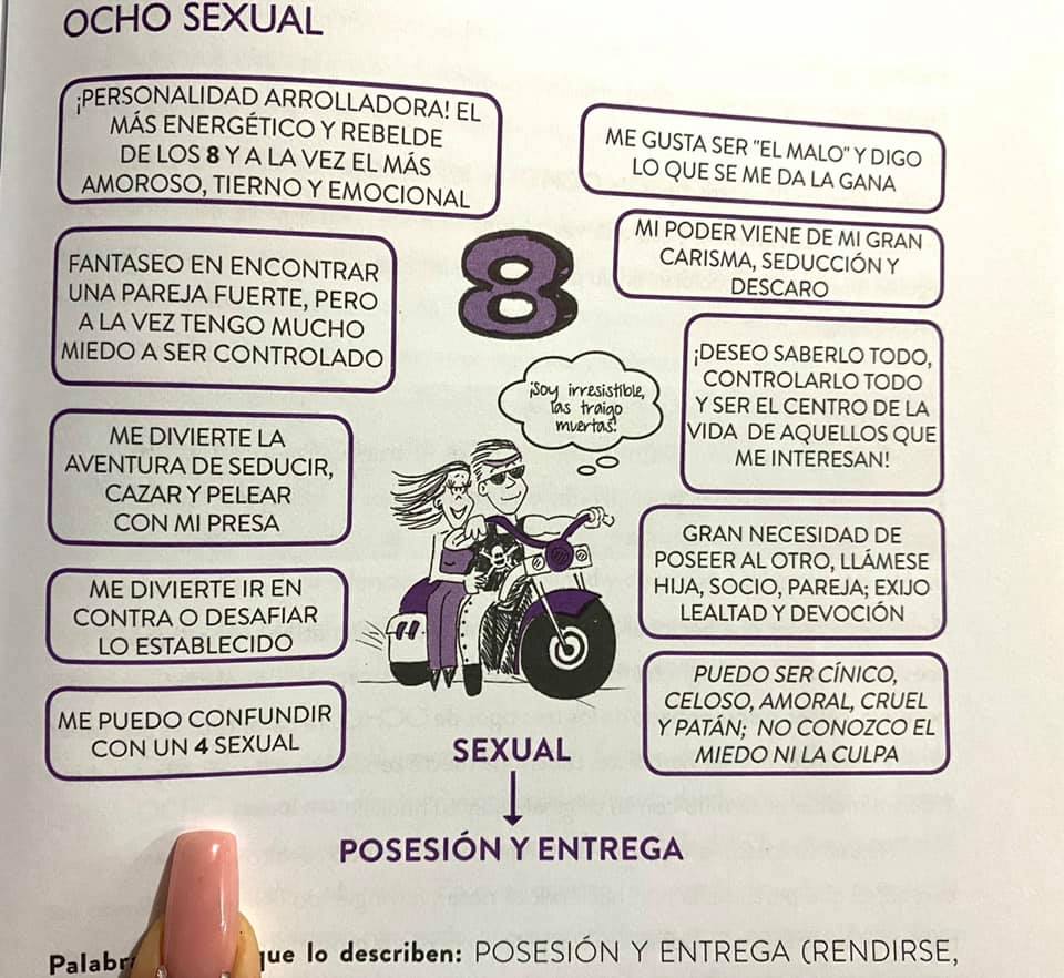 “(…) Mi eneatipo es un 8 sexual y lo que me hace identificarme con él es el haber intentado durante toda mi vida ser fuerte y poderosa para que no me dominen y para poder ser yo la que domine. También me hace identificarme con este eneatipo el haber buscado desde siempre la intensidad en la vida: cuando era adolescente a través de la competición como atleta, después como periodista y ahora en mi propio proceso de desarrollo personal cuando voy a un curso o cuando medito. “La vida tiene que ser intensa y tengo que exprimirla al máximo” sería una de las ideas locas que me hace identificarme con este eneatipo”. (ver post)