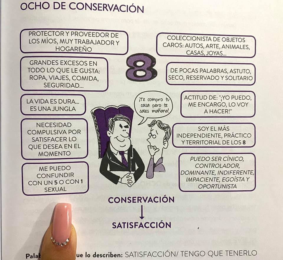 A diferencia de sus compis de triada los unos, que están obsesionados con cumplir la norma, el ocho conservación ni la conoce. No le interesa lo que se supone que hay que hacer. Él hace lo que siente y lo valida siempre. Suelen tener una extraña concepción del bien o la bondad. En palabras, del genial Juanjo Albert: «(…) lo que los ocho de conservación necesitamos entender es que, apoyándonos en nuestra idea de que la bondad y las buenas intenciones no existen, lo que hacemos es descalificar y desacreditar ante nosotros mismos y ante los demás cualquier sentimiento o persona, idea o institución que se oponga a nuestros deseos. También, descalificamos por el mero hecho de tener algo en contra de lo que ir. Cuando un E8 se acerca a la terapia, esto es algo que ya intuye. Aunque no crean demasiado en el proceso terapéutico, es desde esta intuición que se acercan a él. A partir de aquí, es necesario ir asumiendo la angustia que origina el vacío de no tener razones para ir en contra de lo que sea. También hay que asumir que este movimiento compulsivo solo responde a la intolerancia, la frustración y a la angustia, y que, en el fondo, no es más que un deseo de venganza del que ni siquiera se sabe el porqué. Es saludable, por tanto, abrirse a la comprensión de que algo debe de estar tapando esta compulsión al ataque, puesto que no hay razones objetivas para atacar. Los ocho conservación también necesitamos abrirnos a la comprensión de que, en la realidad, hay algo más que lo puramente material y físico, y que nosotros somos algo más que un cuerpo. (…) Los E8 conservación también necesitamos reconocer que la generosa protección al grupo — que alcanza el punto de permitir a los demás que se apoyen en nosotros— nos es más que un modo con el que aseguramos nuestro estatus y ocultamos la inseguridad. Debemos darnos cuenta de que esta generosa oferta impone la condición de que las cosas se hagan siempre a nuestra manera, y exige que los demás renuncien a una parte de sus vidas y a sus modos de hacer. Todo esto implica una obediencia a la que llamamos falsamente lealtad.»*